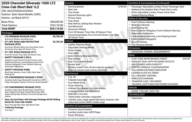 ***CLEAN CARFAX***, **LEATHER**, **MOONROOF**, BLUETOOTH, ALL BOOKS AND KEYS, **BED LINER**, **REMOTE START**, **Back-Up Camera**, **ADAPTIVE CRUISE CONTROL**, **HEATED/COOLED SEATS**, Silverado 1500 LTZ, 4D Crew Cab, EcoTec3 5.3L V8, 8-Speed Automatic, 4WD, Satin Steel Metallic, Jet Black Leather, 120-Volt Bed Mounted Power Outlet, 2 USB Ports (First Row), 2nd Row Heated Outboard Seats, 4-Wheel Disc Brakes, ABS brakes, Adaptive Cruise Control - Camera, Advanced Trailering System, All-Weather Floor Liner (LPO) (AAK), Aluminum Wheels, AM/FM radio: SiriusXM with 360L, Automatic Emergency Braking, Automatic temperature control, Bluetooth® For Phone, Chevytec Spray-On Black Bedliner, Driver Memory, Electronic Stability Control, EZ Lift Power Lock & Release Tailgate, Floor Mounted Center Console, Following Distance Indicator, Forward Collision Alert, Front Bucket Seats, Front fog lights, Front Pedestrian Braking, Fully automatic headlights, Heavy Duty Suspension, Hill Descent Control, Hitch Guidance w/Hitch View, Integrated Trailer Brake Controller, IntelliBeam Automatic High Beam On/Off, Lane Change Alert w/Side Blind Zone Alert, Lane Keep Assist w/Lane Departure Warning, LED Cargo Area Lighting, LTZ Convenience Package, LTZ Convenience Package II, LTZ Premium Package, Off-Road Suspension, Outside Heated Power-Adjustable Mirrors, Perimeter Lighting, Power driver seat, Power Sliding Rear Window w/Rear Defogger, Power Sunroof, Power Tailgate, Premium Bose 7-Speaker Sound System, Radio: Chevrolet Infotainment 3 Premium System, Rear Cross Traffic Alert, Remote Vehicle Starter System, Safety Alert Seat, Safety Package, Safety Package II, Steering Wheel Audio Controls, Steering wheel mounted audio controls, Theft Deterrent System (Unauthorized Entry), Traction control, Trailering Package, Ultrasonic Front & Rear Park Assist, Universal Home Remote, Up-Level Rear Seat w/Storage Package, Ventilated Driver & Front Passenger Seats, Wheels: 20`` x 9`` Polished Finish, Wireless Charging, Z71 Off-Road & Protection Package, Z71 Off-Road Package.