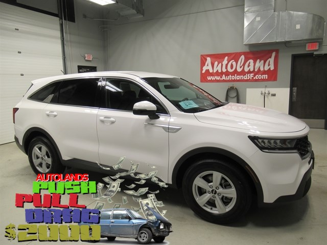 in Glacial White Pearl and Black Cloth, **ONE OWNER**, ***CLEAN CARFAX***, BLUETOOTH, ALL BOOKS AND KEYS, **Back-Up Camera**, Sorento LX, 2.5L I4 DGI DOHC 16V LEV3-ULEV70 191hp, 8-Speed Automatic, FWD, Glacial White Pearl, Black Cloth, 3rd row seats: split-bench, 4-Wheel Disc Brakes, 6 Speakers, ABS brakes, Aluminum Wheels, Apple CarPlay & Android Auto, Auto High-beam Headlights, Electronic Stability Control, Fully automatic headlights, Heated door mirrors, Outside temperature display, Overhead console, Radio: AM/FM Audio System, Remote keyless entry, Spoiler, Steering wheel mounted audio controls, Telescoping steering wheel, Traction control.